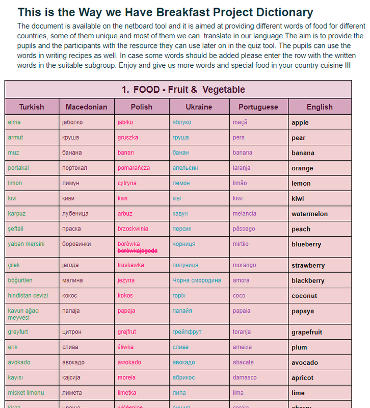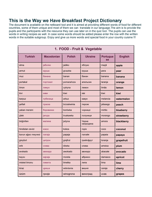 This is the Way we Have Breakfast Project Dictionary The document is available on the netboard tool and it is aimed at providing different words of food for different countries, some of them unique and most of them we can translate in our language.The aim is to provide the pupils and the partic...